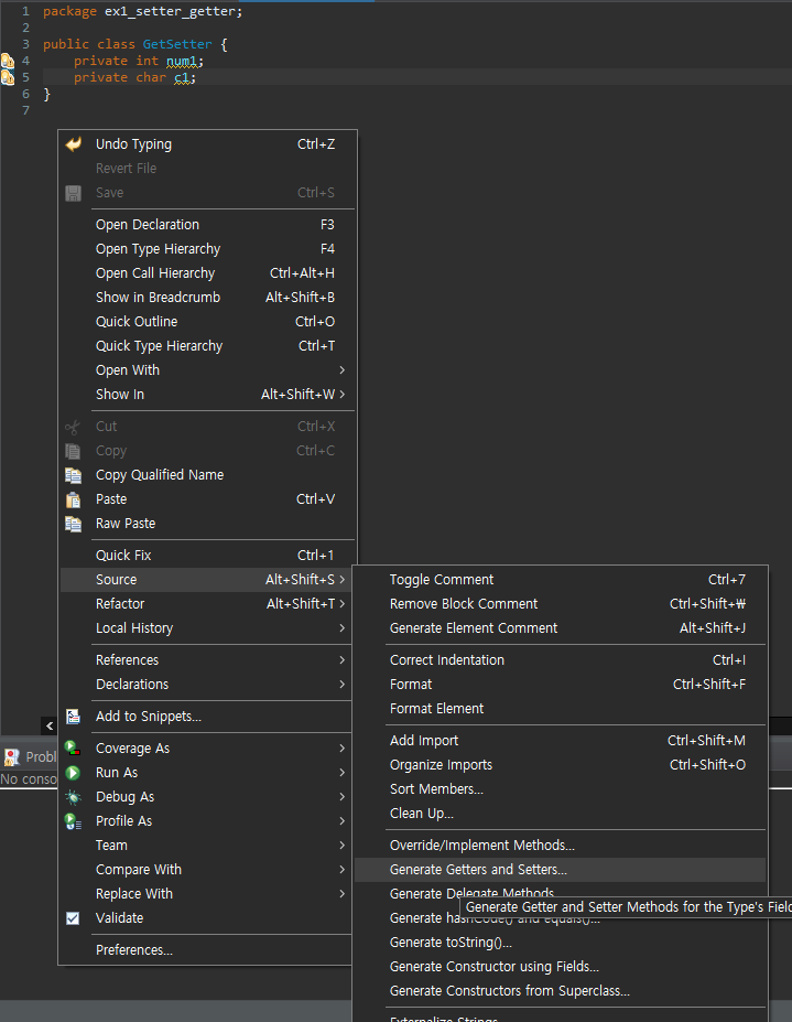 이클립스에서는 setter와 getter를 자동으로 만들어주는 기능을 제공하고 있다.