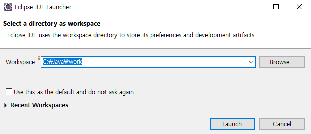 Browse... 을 클릭해 미리 만들어두었던 work 파일을 고른 뒤 Launch 버튼을 눌러준다