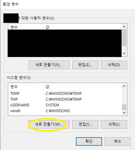 시스템 변수에서 Path라는 걸 클릭한 후 편집을 눌러준다 그리고 빈 공간을 더블 클릭하거나 새로 만들기를 클릭하고
