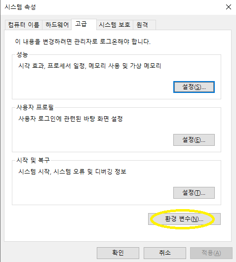 여기서 우측 하단에 있는 환경 변수를 클릭한다.